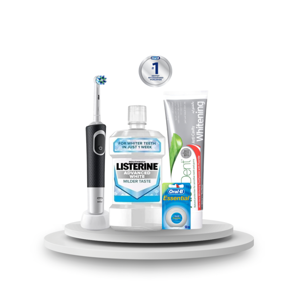 - هذا البكج يشمل ( فرشات اسنان كهربائية oral - b , خيط اسنان , معجون مبيض و غسول فم مبيض )